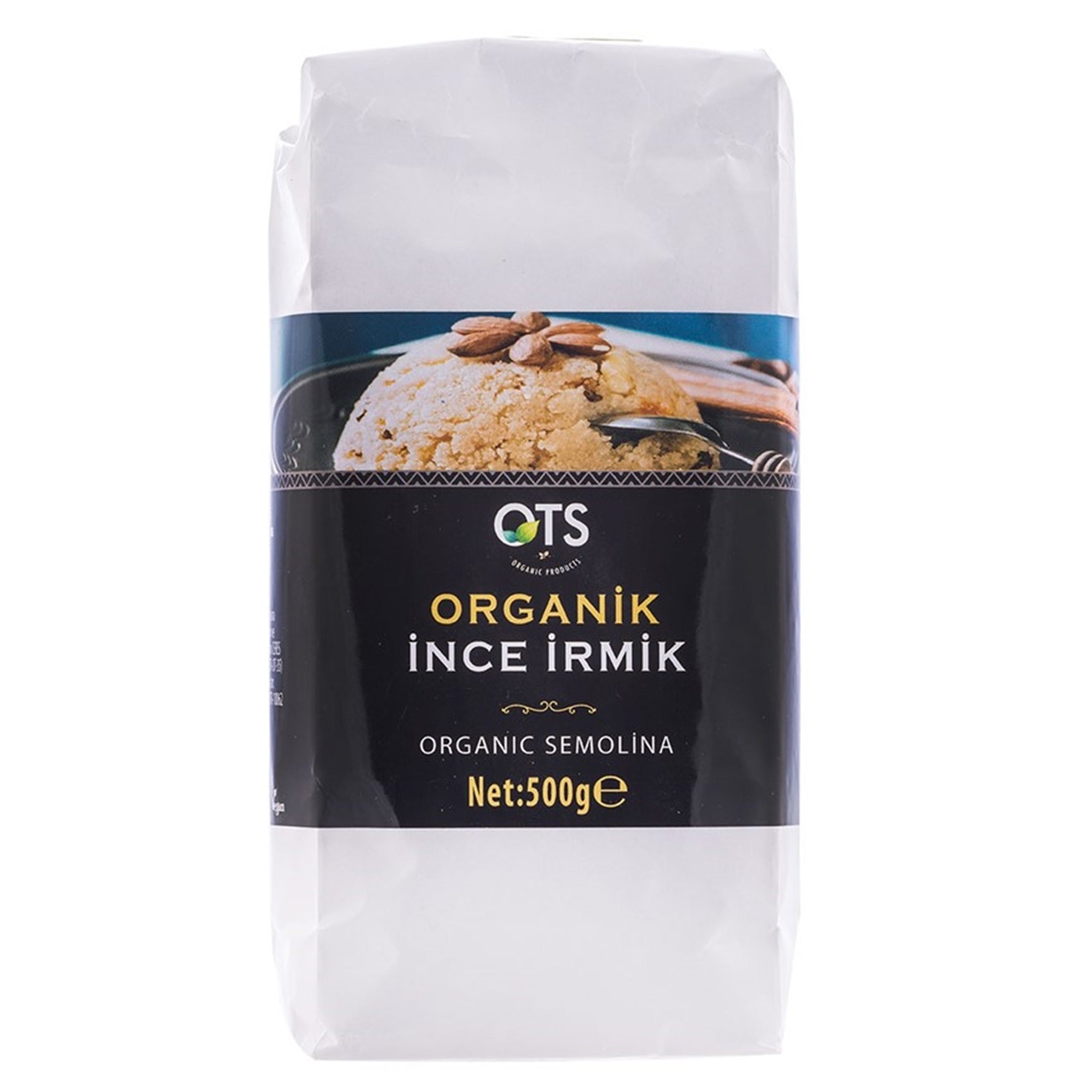 This is a 500-gram package of Fine Semolina (İnce İrmik) sold under the OTS Organic brand. This product is distinct because it is certified organic, meaning the durum wheat used to mill the semolina was grown without synthetic pesticides or fertilizers. Semolina is a coarse flour derived from durum wheat. The "fine" designation indicates that it has been milled to a very smooth, consistent texture. This organic semolina is perfect for preparing smooth, creamy milk puddings, desserts like halva, and certain types of fresh pasta, providing a rich flavor and excellent texture while adhering to organic farming standards.