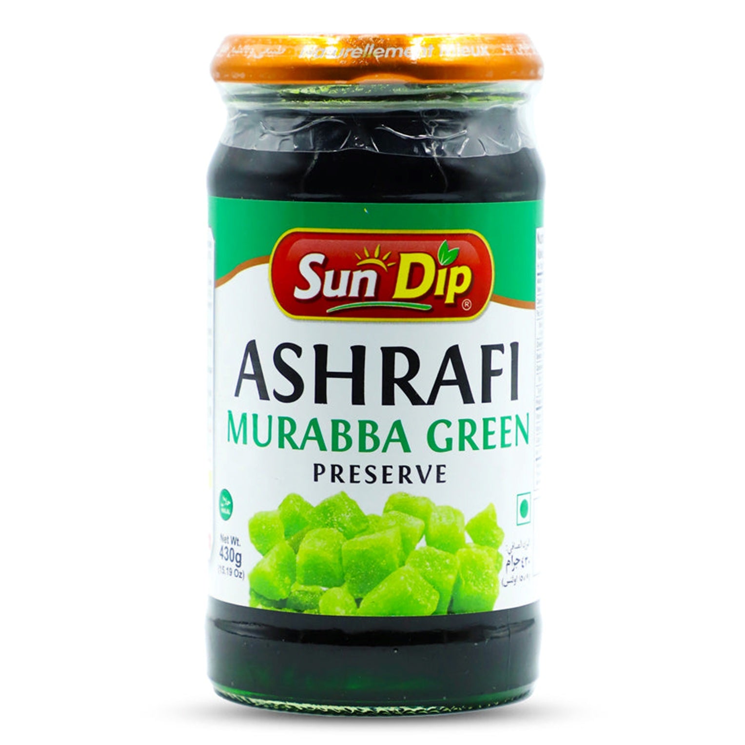 You asked for a description of Sundip Ashrafi Murabba Green, 430g. This is a 430g jar of a traditional South Asian preserve, or 'Murabba', where the main ingredient is typically White Gourd or Winter Melon (Petha), referred to as 'Ashrafi'. The gourd pieces are carefully cooked in a rich sugar syrup, often flavored with cardamom or rose water, until they become sweet, tender, and translucent, with the 'Green' designation indicating the color of this specific variety, making it a highly cherished, intensely sweet preserve often consumed as a traditional dessert or digestive aid.