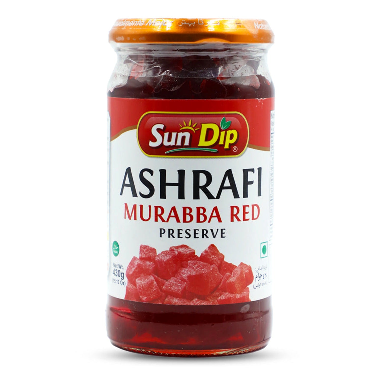 You asked for a description of Sundip Ashrafi Murabba Red, 430g. This is a 430g jar of a traditional South Asian preserve, or 'Murabba', where the main ingredient is typically White Gourd or Winter Melon (Petha), referred to as 'Ashrafi'. The gourd pieces are carefully cooked in a rich sugar syrup, often flavored with cardamom or rose water, until they become sweet, tender, and translucent, with the 'Red' designation indicating the color of this specific variety, making it a highly cherished, intensely sweet preserve often consumed as a traditional dessert or digestive aid.